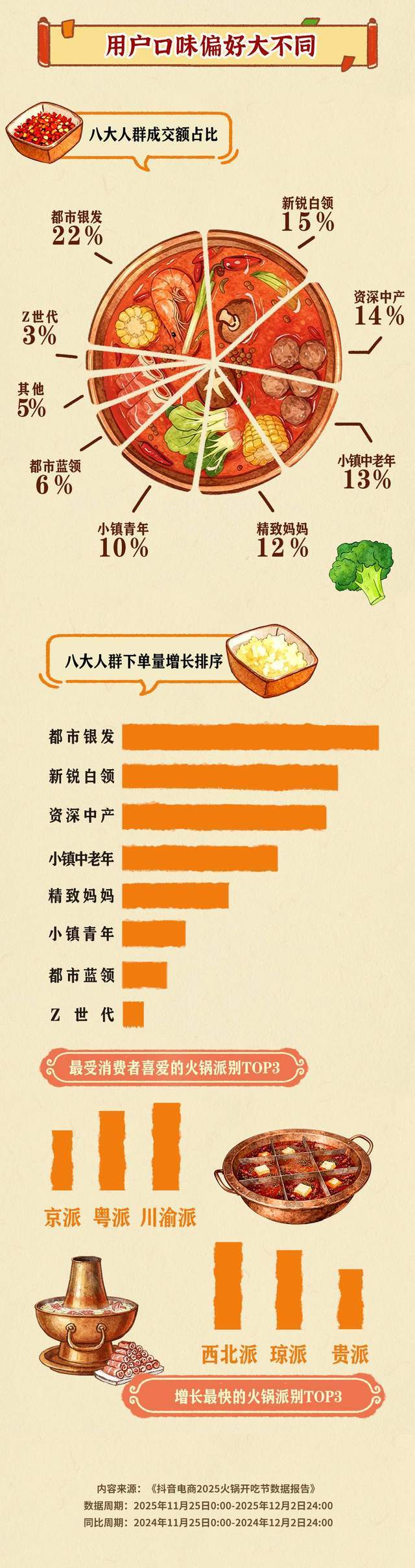 丰富的火锅食材与底料供给,满足了不同人群在不同场景下的消费需求。报告显示,在火锅相关成交额中,都市银发、新锐白领和资深中产是火锅消费最多、也是消费增长最快的三大人群。其中都市银发人群购买力稳健,既舍得为亲朋加餐,也愿意为更健康和讲究的火锅食材买单。总体来看,火锅开吃节期间最受消费者喜爱的火锅派别为川渝派、粤派、京派;增长最快的火锅派别则为西北派、琼派、贵派,既体现了经典口味的稳固基础,也折射出地域特色美食火锅通过直播等渠道不断出圈的趋势。