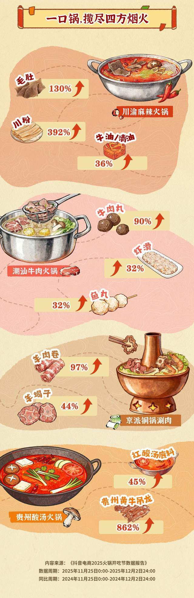 从消费数据看,各大火锅派别在抖音电商平台上均呈现出亮眼表现。川渝麻辣火锅品类中,涮锅的明星单品比如毛肚和川粉分别收获了130%和392%的成交额同比增长,展现出消费者们对正宗麻辣味道的持续偏爱。潮汕牛肉火锅品类中,主打“弹牙口感”的牛肉丸成交额同比增长90%,虾滑、鱼丸、福袋等丸滑也成为不少家庭火锅的“标配”。京派铜锅涮肉中,羊肉卷成交额同比增长97%,羊蝎子同比增长44%,一锅清汤映照出“食材为先”的北方火锅传统。以红酸汤为代表的贵州酸汤火锅亦取得不俗的增长爆发,红酸汤底料成交额同比增长45%,贵州黄牛吊龙同比增长达862%,酸辣开胃的新风味成为许多消费者探索地域美食的热门选择。