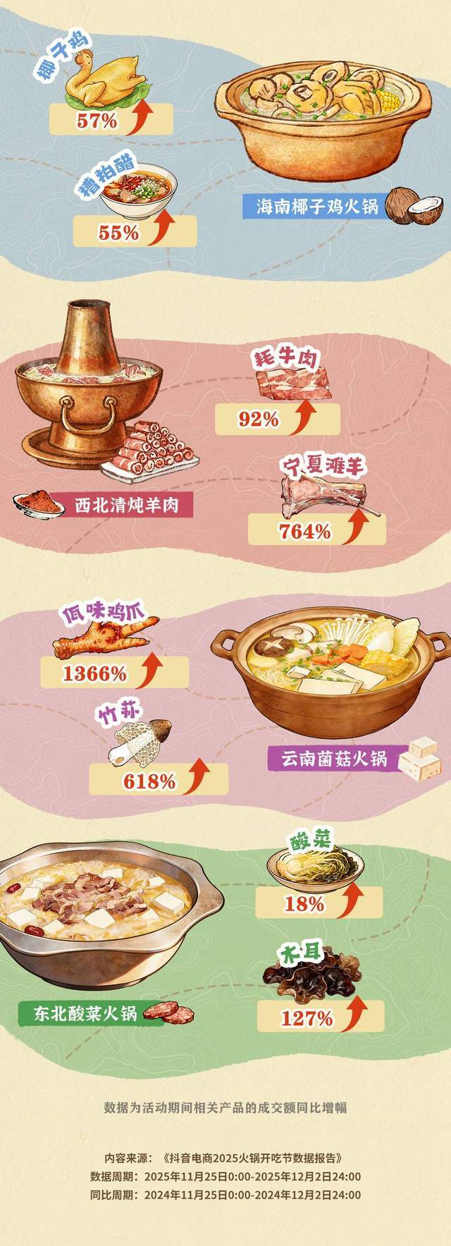 海南椰子鸡火锅品类中,椰子鸡成交额同比增长57%,清甜汤底搭配特色蘸料,走进更多城市家庭的餐桌。以西北清炖羊肉为代表的西北派火锅中,牦牛肉成交额同比增长92%,宁夏滩羊同比增长764%,高原好羊肉通过直播间加速“出圈”。云南菌菇火锅中,佤味鸡爪成交额同比增长1366%,竹荪同比增长618%,浓郁地道的特色风味与山野鲜珍受到尝鲜人群的青睐。东北酸菜火锅中,酸菜成交额同比增长18%,木耳同比增长127%,咸鲜酸香的东北味道在南北方市场都收获认可。